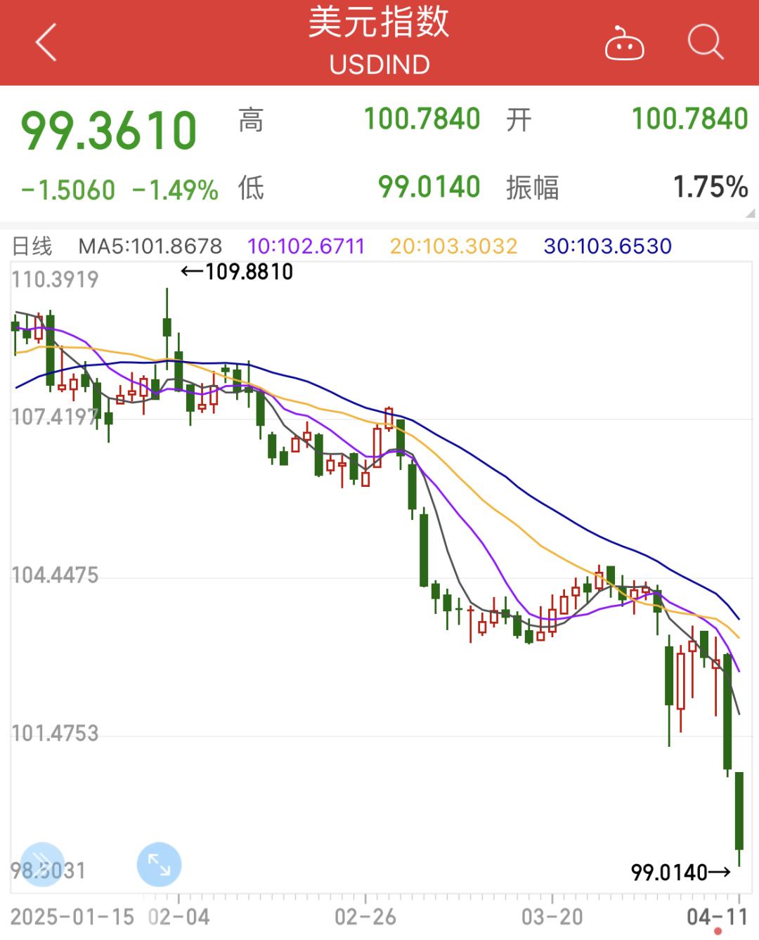 数据显示,近一周以来,美元指数跌超3.5%,并于4月11日盘中一度跌破100关口。同期,非美货币的走势也较震荡,新兴市场货币承压,日元、欧元等避险货币表现升值。