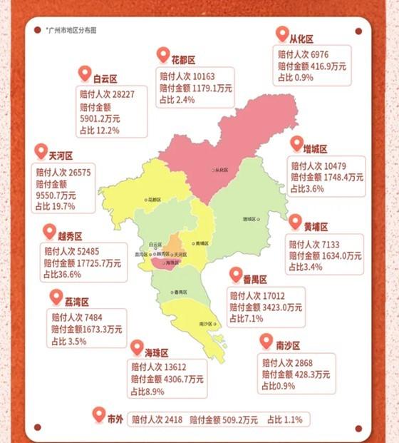 据悉,目前广州有超过2400家医保定点医疗机构支持“穗岁康”的“一站式”理赔结算服务,参保人在出院时可实现与医保统筹同步结算,无需另外提交申请或垫付医药费。具体来看,越秀区、天河区和白云区的定点医疗机构“一站式”结算理赔金额分别位列前三,其中越秀区占总赔付金额的36.5%。对于部分在市外就医的参保人,可以采用“零星理赔”的方式,另外提交相关就医资料申请报销理赔。