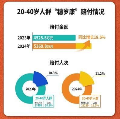 值得关注的是,2024年“穗岁康”参保人群中,20岁-40岁人群赔付金额及人次均有所上升,其中赔付金额同比增长18.6%,赔付人次也从10.3%上升到11.2%。相关负责人表示,80后、90后群体面对职场和生活的双重压力,重疾发生率仅次于老年人这一年龄段,显示疾病趋于年轻化。