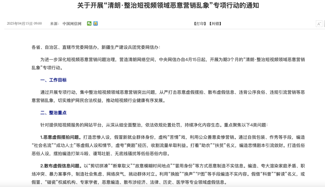 4月15日,据“网信中国”官方公众号消息,为进一步深化短视频恶意营销问题治理,营造清朗网络空间,中央网信办自4月15日起,开展为期3个月的“清朗·整治短视频领域恶意营销乱象”专项行动。