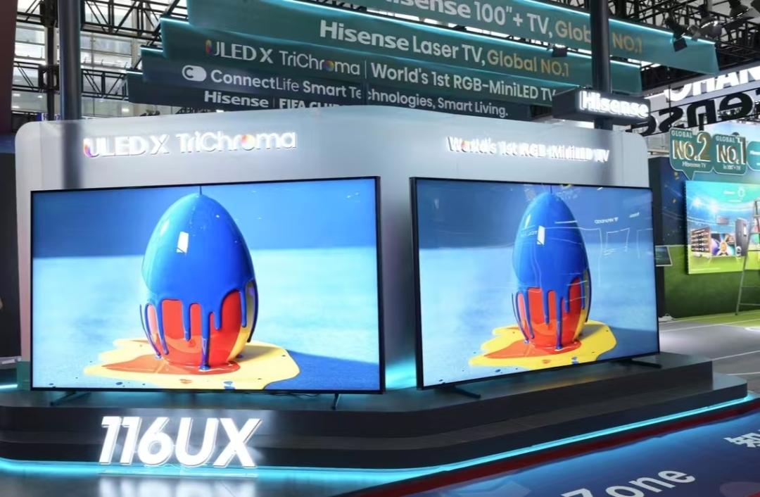 在海信展区里,两台116英寸UX RGB-Mini LED电视展出了在画质方面的两大重磅技术——RGB三维控色技术及信芯AI画质芯片技术。116英寸UX是全球首台RGB三色Mini LED电视,也是全球最大的Mini LED电视,相较于单色Mini LED背光和OLED产品,其色域表现更优越,高达97% BT.2020,峰值亮度高达10000尼特,且相较传统显示产品可节能20%以上。