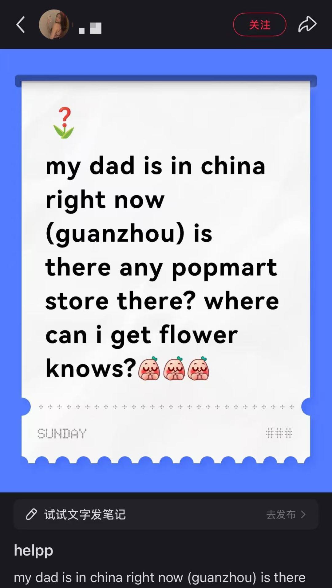 三天前,一位哥伦比亚的网友在国内社交平台小红书上发布了一条帖子,写道:我爸爸现在在中国广州,那里有泡泡玛特的店吗?国内网友反应迅速,在评论区留言道:在中国泡泡玛特哪都有,没想到这么火!