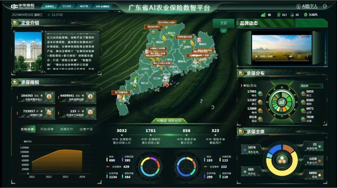 据悉,该项目包含广东省AI农险数智平台、中华农博智问小程序、AI智能穿戴设备、AI数字人“小华”四大部分。AI农业保险数智平台依托AI大模型技术,构建了省-市-县三级数据架构,绘制农业产业一张图、气象灾害预警一张图、防灾减损管理一张图、卫星遥感一张图“四张地图”,统筹整合全省农业保险防灾防损示范基地资源,建立省级AI作战指挥中心,做到农业生产实时监控、农业风险实时预警、防灾资源远程调度、服务决策快速落地。