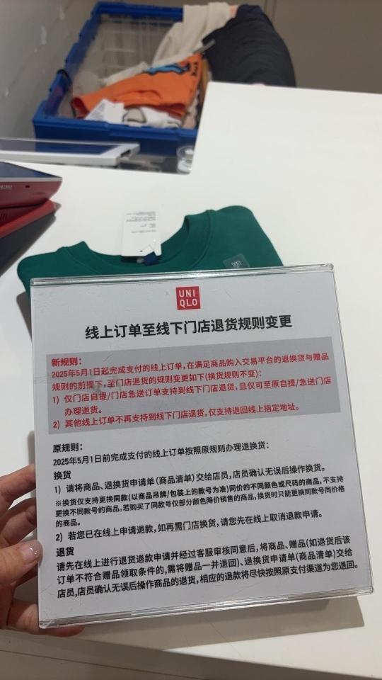 4月22日,记者走访广州优衣库门店发现,在退换工作台的地方,门店内均有摆放统一的规则退换变更通知。记者了解到,新规则下就是线上买的只能线上渠道退货,线下买的要到线下门店退货。举个例子,线上下单门店提货退换,5月1日前仍然可以按照旧规则“可选择不同门店”,5月1日后,消费者的线上下单还是可以到门店提货退货,但必须前往提货时的门店,其他门店不能互通。