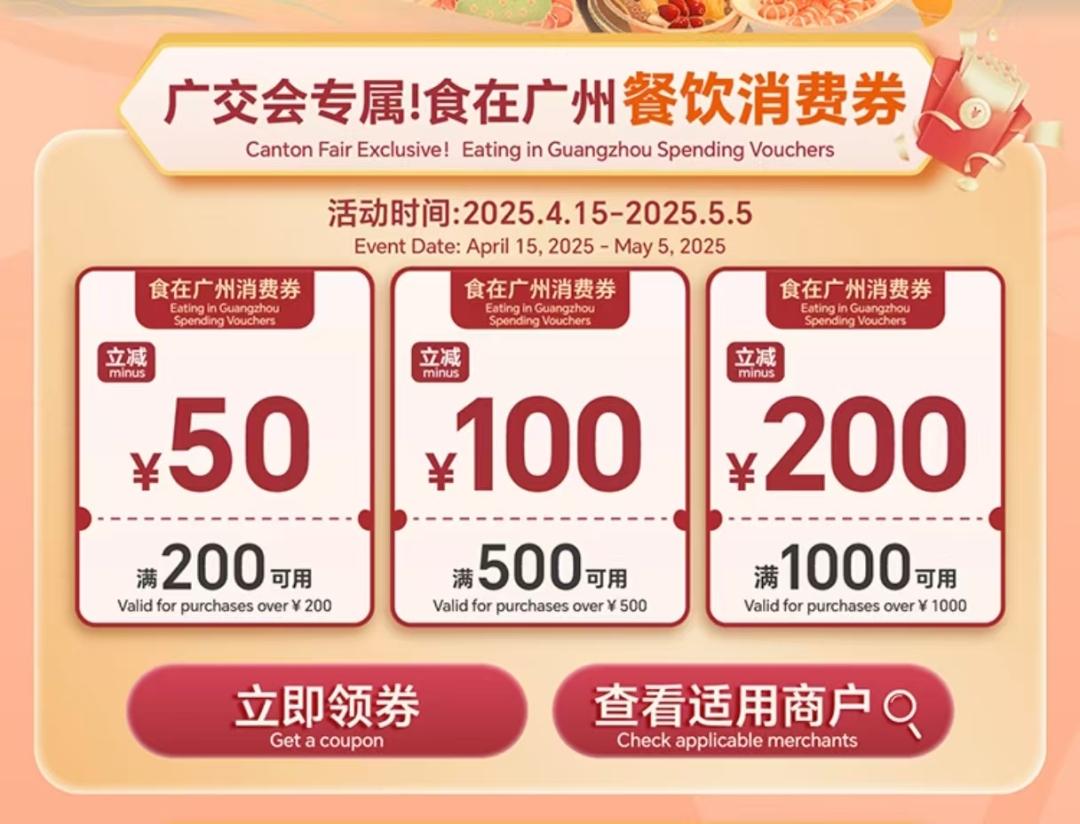 为配合这一系列精彩纷呈的“广交会+美食”活动,广州市商务局再次推出“食在广州”专项餐饮消费券。在广交会音乐美食嘉年华现场,客商们可现场扫码领取最高200元专属消费券,享受美食的同时还能享受优惠。此外,全市2000多家餐饮门店也参与其中,用真诚和热情一起迎接来自世界各地的朋友。广东银联也推出了“0.1元购6.2折”优惠券、指定产品“享8折最高25元叠加优惠”等福利,让全球客商和广大市民享受到折上折的消费优惠。