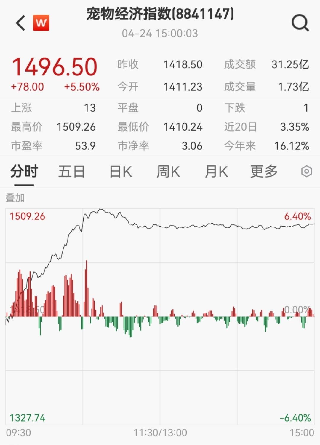 4月24日,宠物经济概念全面走强,板块内多只成分股强势上涨,宠物经济指数(8841147.WI)上涨5.50%。中宠股份、乖宝宠物两大龙头股股价均创历史新高,中宠股份开盘半小时涨停。天元宠物、依依股份、佩蒂股份、源飞宠物等收涨逾4%。