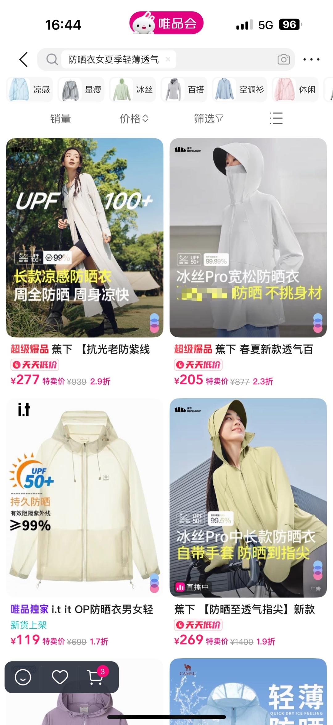 在番禺大学城读书、今年“五一”准备前往潮汕游玩的大学生林琦表示,她认真对比了多个品牌防晒衣,发现蕉下一款3折后仅需166元、UPF50+的防晒衣,在功能性、舒适度、透气感上不错。她便果断在唯品会上下单了蕉下这款黑胶帽檐的长款防晒衣。