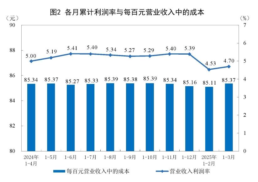 1—3月份,规模以上工业企业每百元营业收入中的成本为85.37元,同比增加0.17元;每百元营业收入中的费用为8.43元,同比减少0.16元。