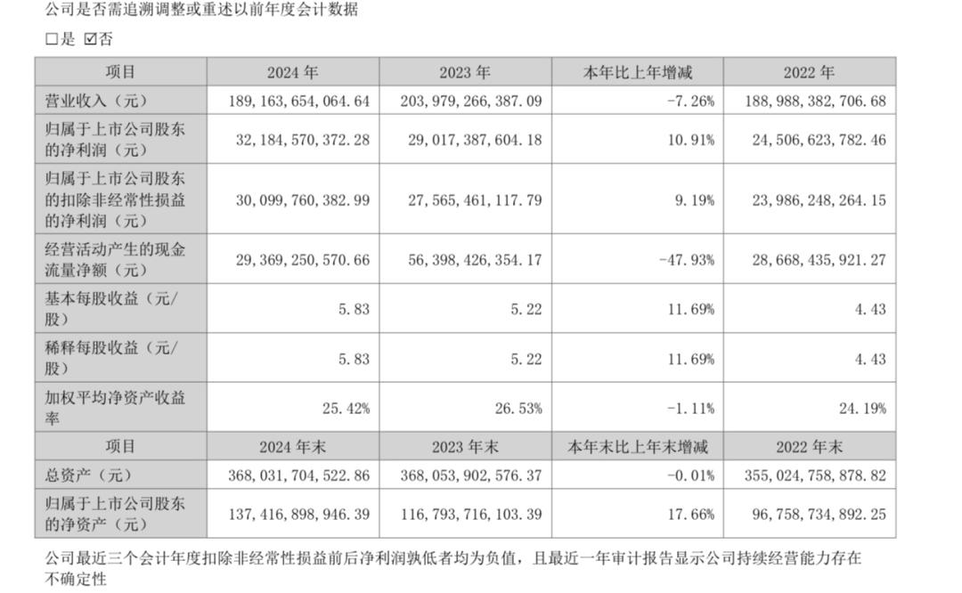 年报显示,2024年格力电器实现营业收入1891.64亿元,同比下降7.26%;归属于上市公司股东的净利润321.85亿元,同比增长10.91%;基本每股收益5.83元/股,同比增长11.69%。