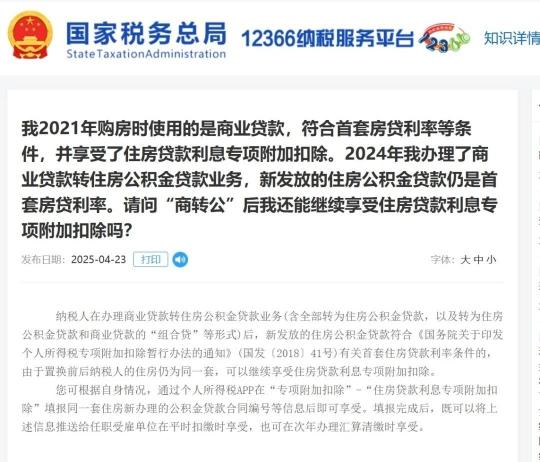 二、购房时使用的是商业贷款,并享受了住房贷款利息专项附加扣除,办理了商业贷款转住房公积金贷款业务,新发放的住房公积金贷款仍是首套房贷利率。“商转公”后还能继续享受住房贷款利息专项附加扣除吗?