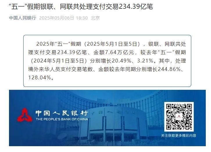 2025年“五一”假期(2025年5月1日至5日),银联、网联共处理支付交易234.39亿笔、金额7.64万亿元,较去年“五一”假期(2024年5月1日至5日)分别增长20.49%、3.21%。其中,处理境外来华人员支付交易笔数、金额较去年同期分别增长244.86%、128.04%。
