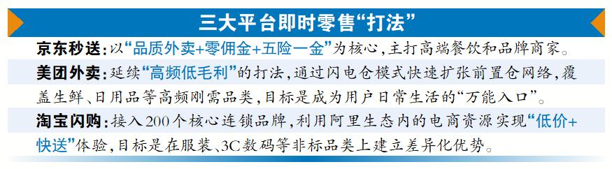 随着外卖战事升级,京东通过“零佣金”政策吸引连锁商超布局广阔的即时零售业务,阿里则通过内部整合淘宝、饿了么、盒马等渠道资源,并接入200个核心连锁品牌深化业务。4月底,美团宣布美团外卖柜始终对全行业外卖小哥开放。