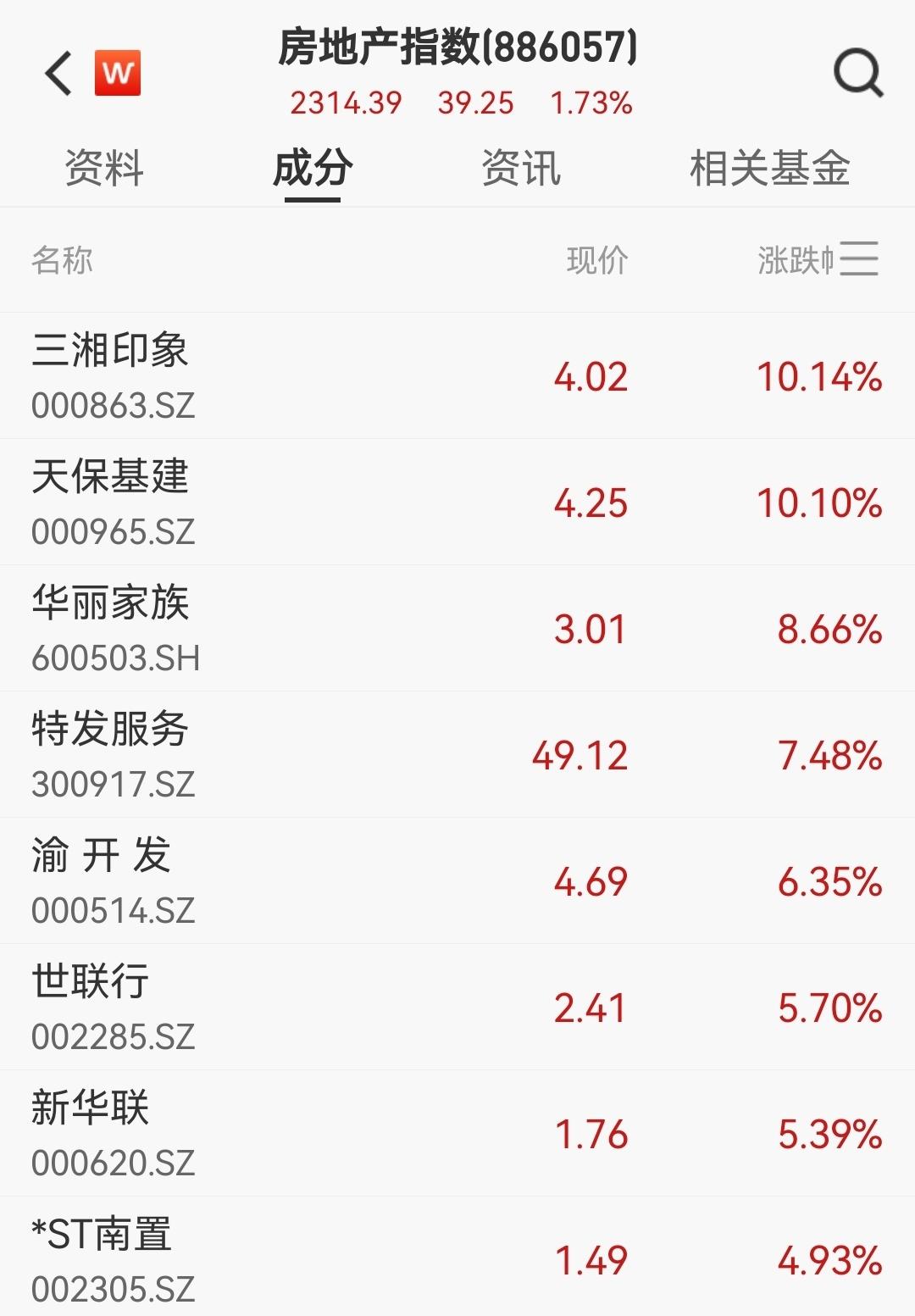 受利好消息刺激,地产股集体走强,天保基建、渝开发、华丽家族、三湘印象、新华联涨停,福星股份、光大嘉宝、绿地控股、城投控股等多股涨超5%。