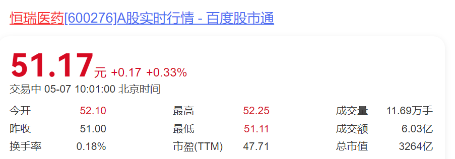 在A股市场上,截至记者发稿时,恒瑞医药股价上涨。