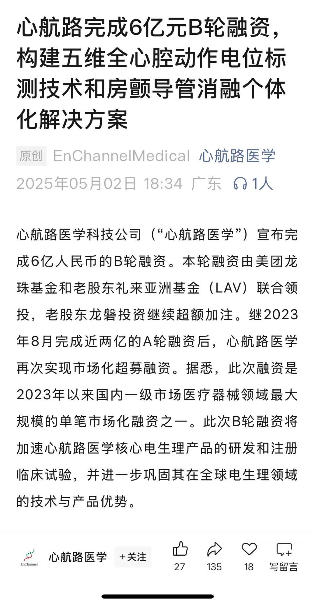 近日,心航路医学科技公司(“心航路医学”)宣布完成6亿元人民币的B轮融资。本轮融资由美团龙珠基金和老股东礼来亚洲基金(LAV)联合领投,老股东龙磐投资继续超额加注。继2023年8月完成近两亿元的A轮融资后,心航路医学再次实现市场化超募融资。此次B轮融资将加速心航路医学核心电生理产品的研发和注册临床试验,并进一步巩固了其在全球电生理领域的技术与产品优势。