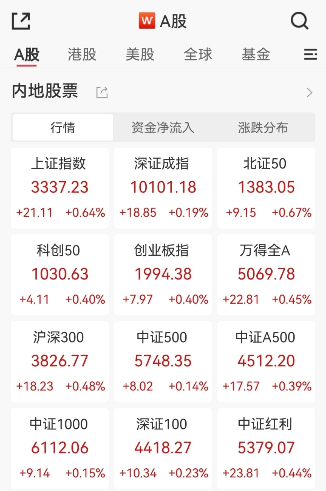 5月7日,A股早盘高开后震荡,三大指数小幅上涨。上证指数午盘涨0.64%报3337.23点,深证成指涨0.19%,创业板指涨0.4%,科创50涨0.4%。A股半日成交9890.32亿元,全市场3479只个股上涨。