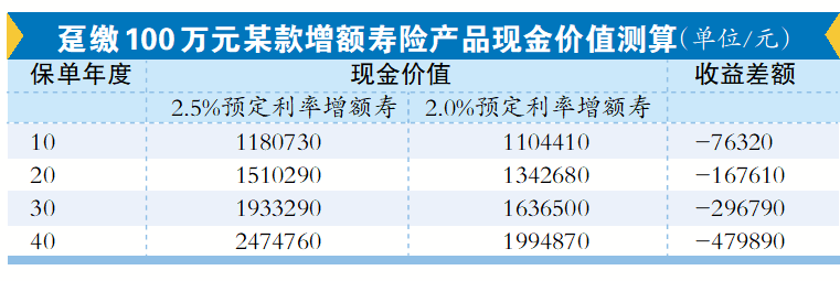 以某增额寿险产品为例,同一位被保险人趸缴100万元,若预定利率从2.5%降至2.0%,保单持有10年,现金价值减少了7万多元,20年时减少超16万元,40年时收益减少了将近48万元,投资者的收益下降了。多位券商分析师认为,预定利率进一步下调后,传统险产品竞争力下降难以避免,分红险销售能力更为凸显。
