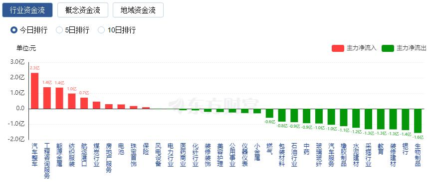 截至收盘,汽车整车、工程咨询服务、能源金属等净流入排名靠前,其中汽车整车净流入2.32亿元。