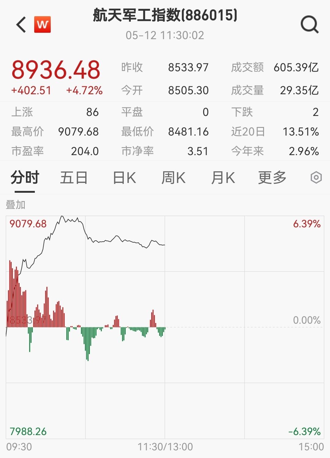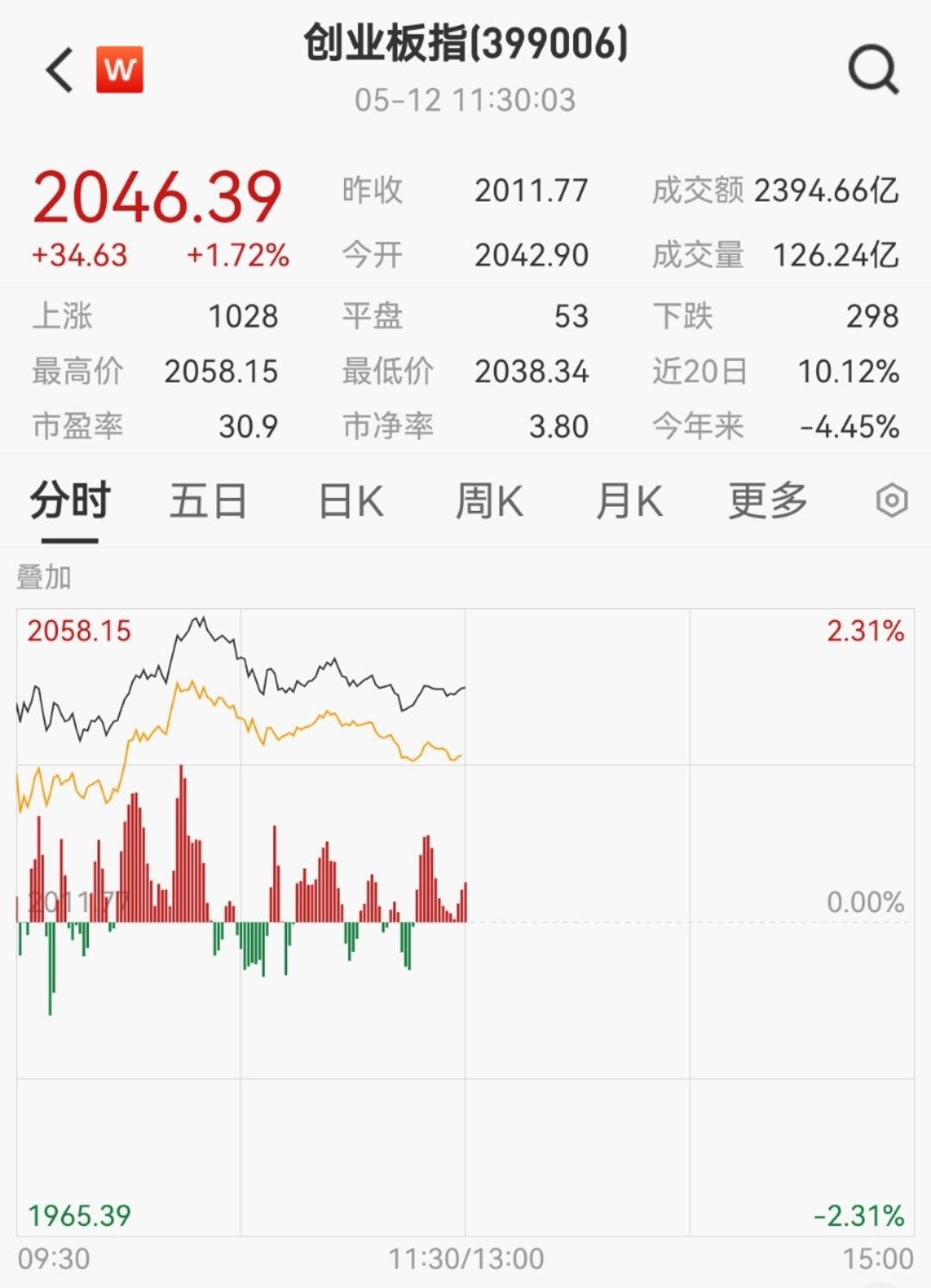 5月12日,A股三大指数开盘后冲高震荡,创业板指领涨。截至午盘收盘,沪指涨0.37%,深成指涨1.06%,创业板指涨1.72%。全市场3496只个股飘红,成交额超8637亿元。