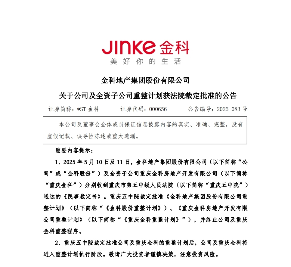 5月11日晚间,*ST金科(SZ000656)发布公告称,金科地产集团股份有限公司(以下简称金科股份)及全资子公司重庆金科房地产开发有限公司(以下简称重庆金科)分别收到重庆市第五中级人民法院送达的《民事裁定书》,裁定批准金科及重庆金科的重整计划。这也就意味着,意味着金科及子公司重庆金科的重整取得重要进展,下一步将进入执行环节。