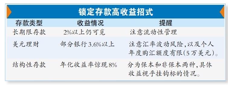 三是部分具有一定风险承受能力的投资者,可考虑投资结构性存款产品。记者查询多家银行的结构性存款产品信息,发现挂钩不同标的的保本型结构性存款最低年化收益率范围在0%~2.7%,最高年化收益率可以达到3.5%~6%;而非保本型结构性存款的最高年化收益率可以达到8%。有理财经理提醒,非保本型的产品有可能承担本金损失。