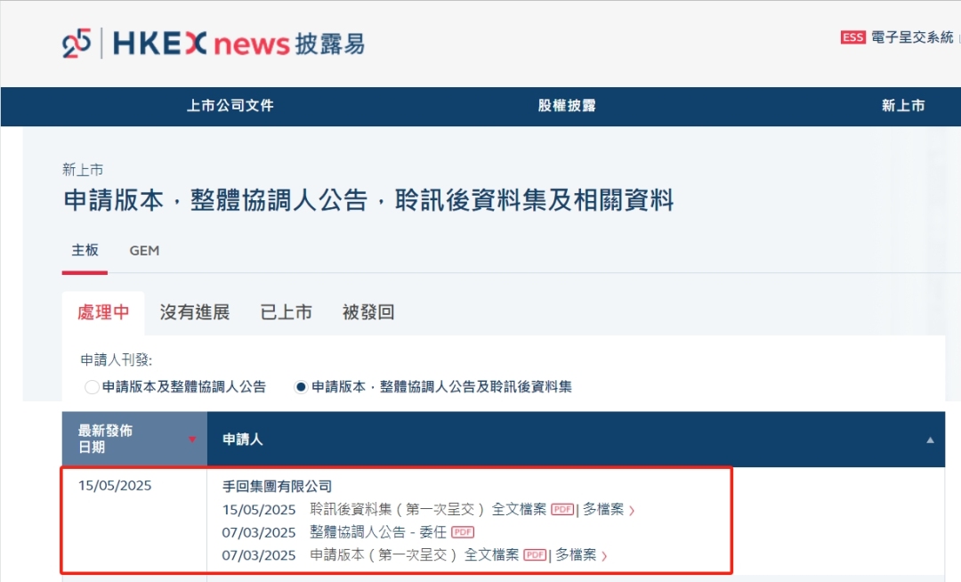 港交所5月15日披露,手回集团有限公司(简称:手回集团)通过港交所主板上市聆讯,华泰国际、中金公司为其联席保荐人。