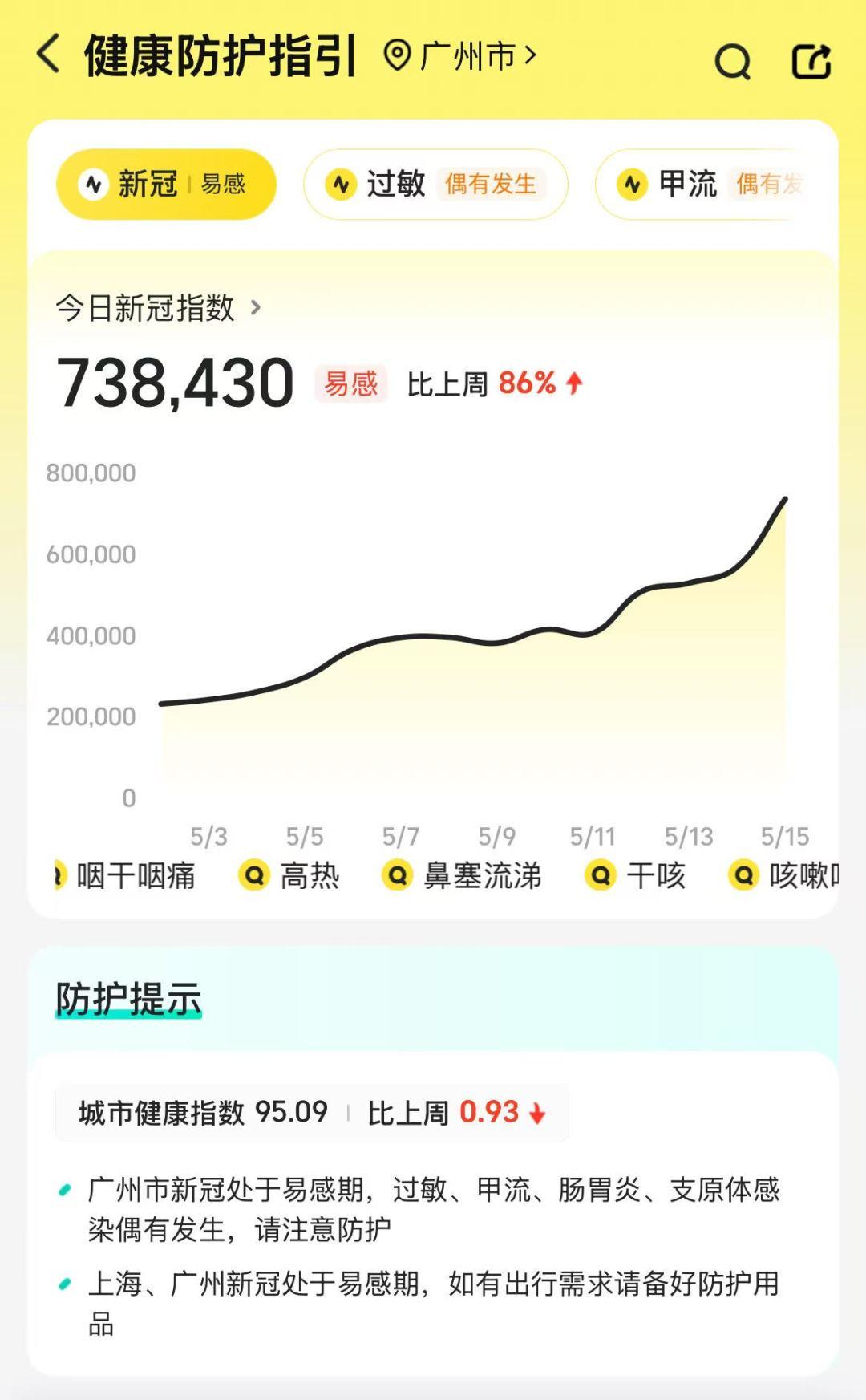 5月15日,新冠药物搜索量日环比增长超1倍。美团买药健康指数显示,广州、深圳、珠海、佛山四城新冠用药近期出现连续上涨。其中,广州地区搜索量较上周增长85%,深圳地区搜索量较上周增长75%,用户需求主要集中在新冠抗原、相关特效药以及止咳消炎类药品。目前,线上平台多款新冠药物均有销售,供给充足,不必过度囤药。