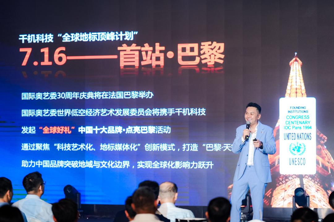 千机科技集团创始人石哲元在开场致辞中介绍了千机科技2025年的全新战略“千机·让品牌点亮世界”,全球100+“天空艺术馆”发展计划,由国际奥艺委世界低空经济艺术发展委员会联合千机科技发起的“用艺术点亮世界——全球地标顶峰计划”。他表示在今年7月16日,在法国巴黎联合国教科文总部举办的“2025国际奥艺委三十周年盛典”系列活动中,世界低空经济艺术发展委员会将携手千机科技与十大中国品牌,共同点亮巴黎埃菲尔铁塔,为中国企业的国际化征程增添光彩。