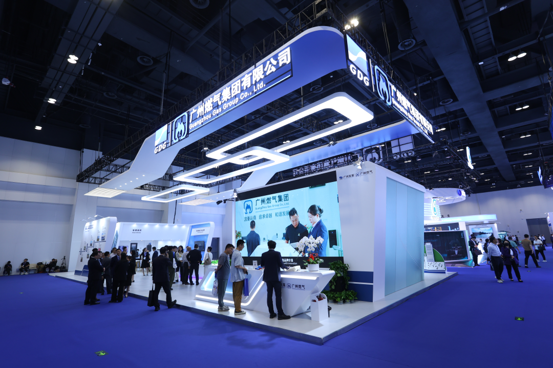开展首日,广州燃气集团在展馆1层B区E02重磅开启300平方米沉浸式展台。熊熊蓝焰与简约白色主色调碰撞出科技美感,丝带状LOGO设计跃动其间,诠释集团打造天然气一体化产业链的硬核实力与创新基因。现场首次亮相的全新企业宣传片霸屏LED大屏,以震撼视效展现集团绿色转型成果,吸引观众驻足观看。