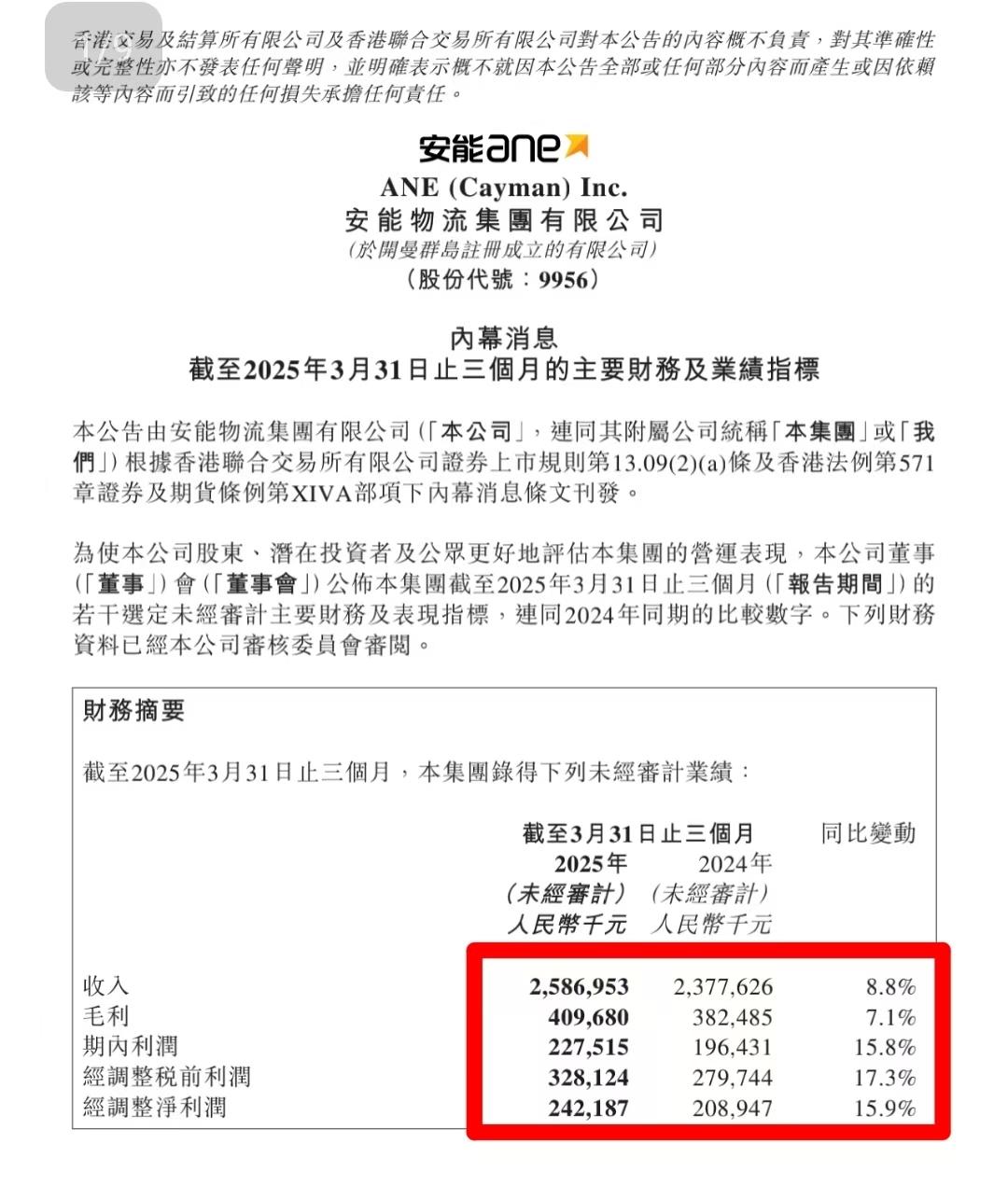 5月26日,中国快运龙头企业安能物流(9956.HK)发布2025年一季度业绩报告。数据显示,公司零担货运总量达305万吨,同比增长5.9%;营收25.87亿元,同比增长8.8%,业务规模稳步增长;经调整净利润同比增长15.9%至2.42亿元,经调整净利润率同比提升至9.4%,盈利能力持续优化。