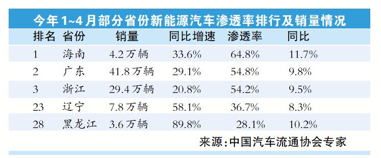 调查显示,全国范围内冬季温度介于5℃至15℃的低温区域,覆盖了多达60%的新能源汽车用户,这些区域正是新能源消费的热点地区。今年1~4月份各省新能源汽车上险数据也显示了“南北消费”差异。其中,海南、广东、浙江、广西等南方城市成为新能源汽车渗透率排名前列的城市。但在河北、吉林、辽宁等冬季较为寒冷的北方地区,新能源汽车渗透率只有35%左右,黑龙江、青海等地的渗透率更低至30%以下。