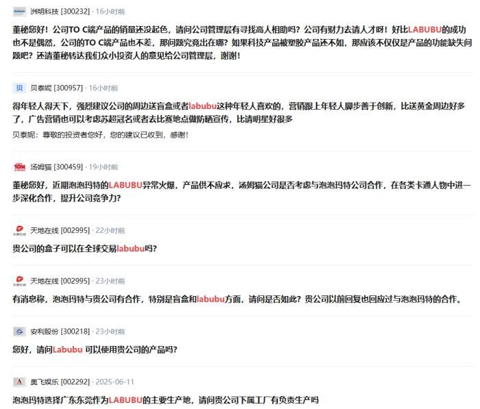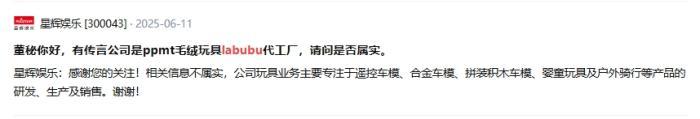 一方面,投资者关心上市公司是否和Labubu有合作。如,星辉娱乐就被问到,是否为泡泡玛特毛绒玩具Labubu代工厂,但遭到星辉娱乐否认。