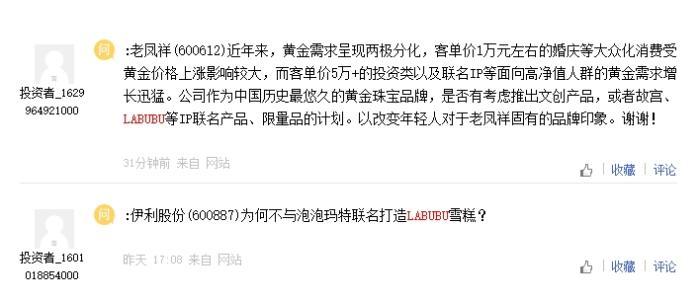 另一方面,投资者建议上市公司和泡泡玛特建立合作。如,伊利股份被建议推出联名款Labubu雪糕;潮宏基、老凤祥被建议搞Labubu联名产品;百纳千成被建议出Labubu精灵系列动画电影或者动画剧集。