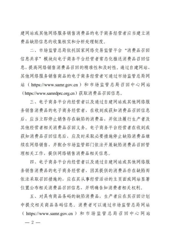《公告》对网络销售消费品召回监管提出新要求:规定电子商务经营者需建立健全消费品缺陷信息收集处理机制,明确市场监管总局将向电商平台常态化推送消费品召回信息,细化电子商务经营者在收到消费品召回信息后需履行的义务,要求具有商品条码信息的生产者在召回计划中提供商品条码信息,明确跨境电商零售进口消费品的境内召回责任主体,提出市场监管部门将组织实施电商平台消费品安全与召回共治承诺。