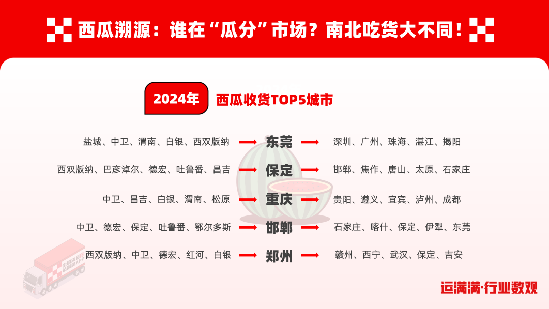 冬天想“围着暖气吃西瓜”?全靠西双版纳、湛江、陵水等南方城市供给!运满满行业数据观察发布的数据显示,冬天的西瓜发货TOP5城市分别为西双版纳、湛江、陵水、北海、昌江,吃瓜城市TOP5都是北方城市,分别为保定、郑州、嘉兴、淄博、沈阳。这些城市的西瓜流向也很有意思,比如保定收到瓜后又运往首都北京,郑州、石家庄、天津等省会城市、直辖市,嘉兴的瓜发往苏州、上海、南京、合肥、宁波,郑州、淄博、沈阳的瓜分别就近供给河南省内、山东省内、东北地区。
