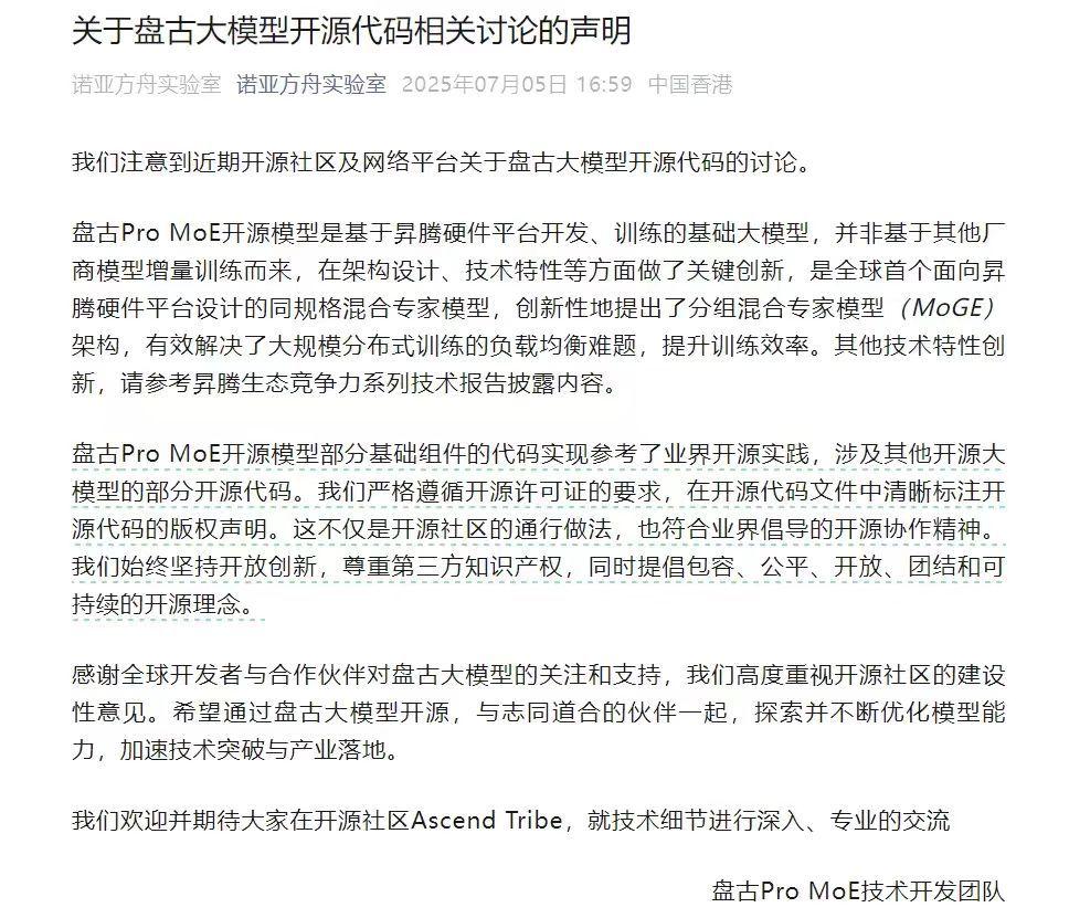 近日,针对盘古大模型涉嫌抄袭阿里通义千问模型的质疑,华为盘古Pro MoE技术开发团队发表声明称,盘古Pro MoE开源模型是基于昇腾硬件平台开发、训练的基础大模型,并非基于其他厂商模型增量训练而来。开发团队表示,盘古Pro MoE开源模型部分基础组件的代码实现参考了业界开源实践,涉及其他开源大模型的部分开源代码,“我们严格遵循开源许可证的要求,在开源代码文件中清晰标注开源代码的版权声明。这不仅是开源社区的通行做法,也符合业界倡导的开源协作精神”。开发团队还强调,始终坚持开放创新,尊重第三方知识产权,同时提倡包容、公平、开放、团结和可持续的开源理念。