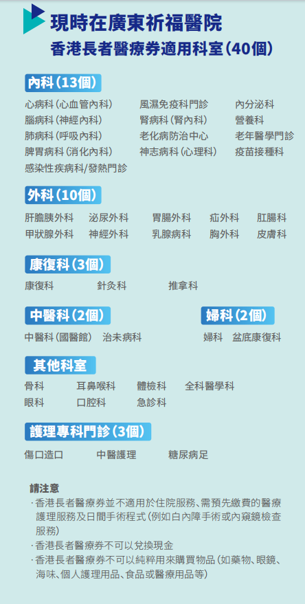 随着香港长者医疗券的启用,预计每年将有更多符合条件的香港长者享受到高效便捷的祈福医疗。目前医疗券适用于医院40个指定科室,涵盖内外科、康复科、眼科等常见科室以及疫苗接种、预防保健等服务。