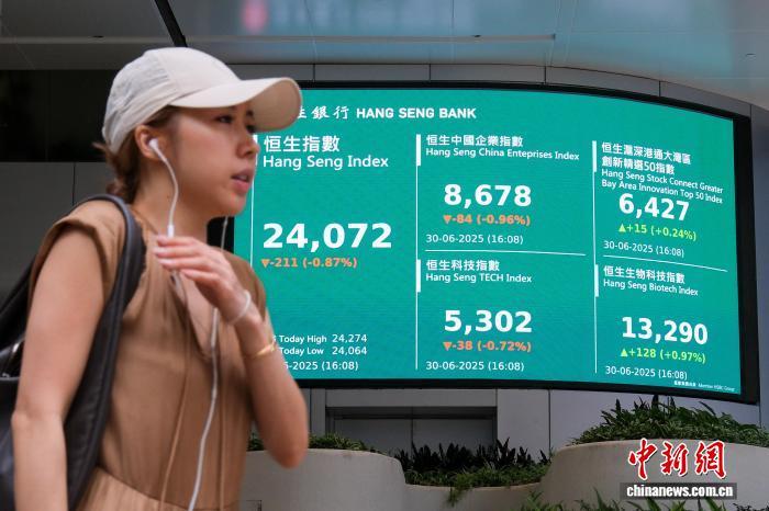7月29日,香港交易及结算所有限公司表示,今年上半年,其全资附属公司香港联合交易所有限公司平均每日成交金额达2402亿港元,同比增长118%。图为6月30日,2025年上半年最后一个交易日,香港恒生指数收市报24072.28点。(资料图)记者陈永诺摄