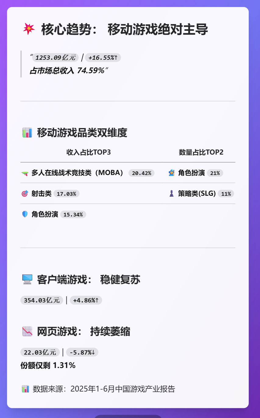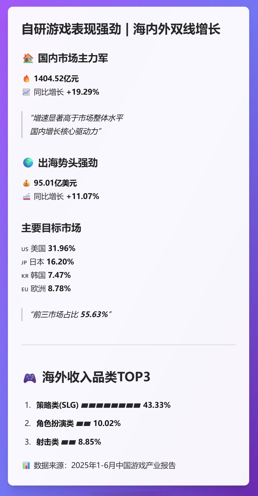 2025年7月31,在2025chinajoy CDEC高峰论坛上,中国游戏产业研究专家委员会和游戏出版工作委员会发布了《2025年1—6月中国游戏产业报告》,该报告详细分析了上半年中国游戏产业的运行状况。数据显示,2025年1—6月,中国游戏产业整体表现强劲,国内市场和海外收入双双实现增长,产业规模持续扩大,为国民经济注入新动力。