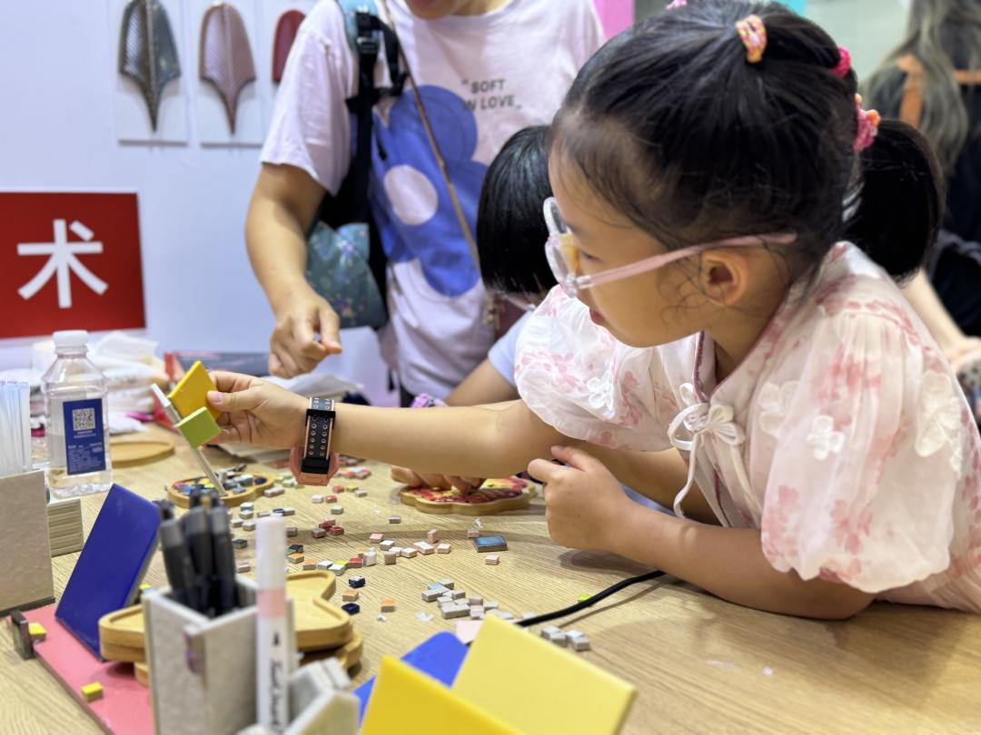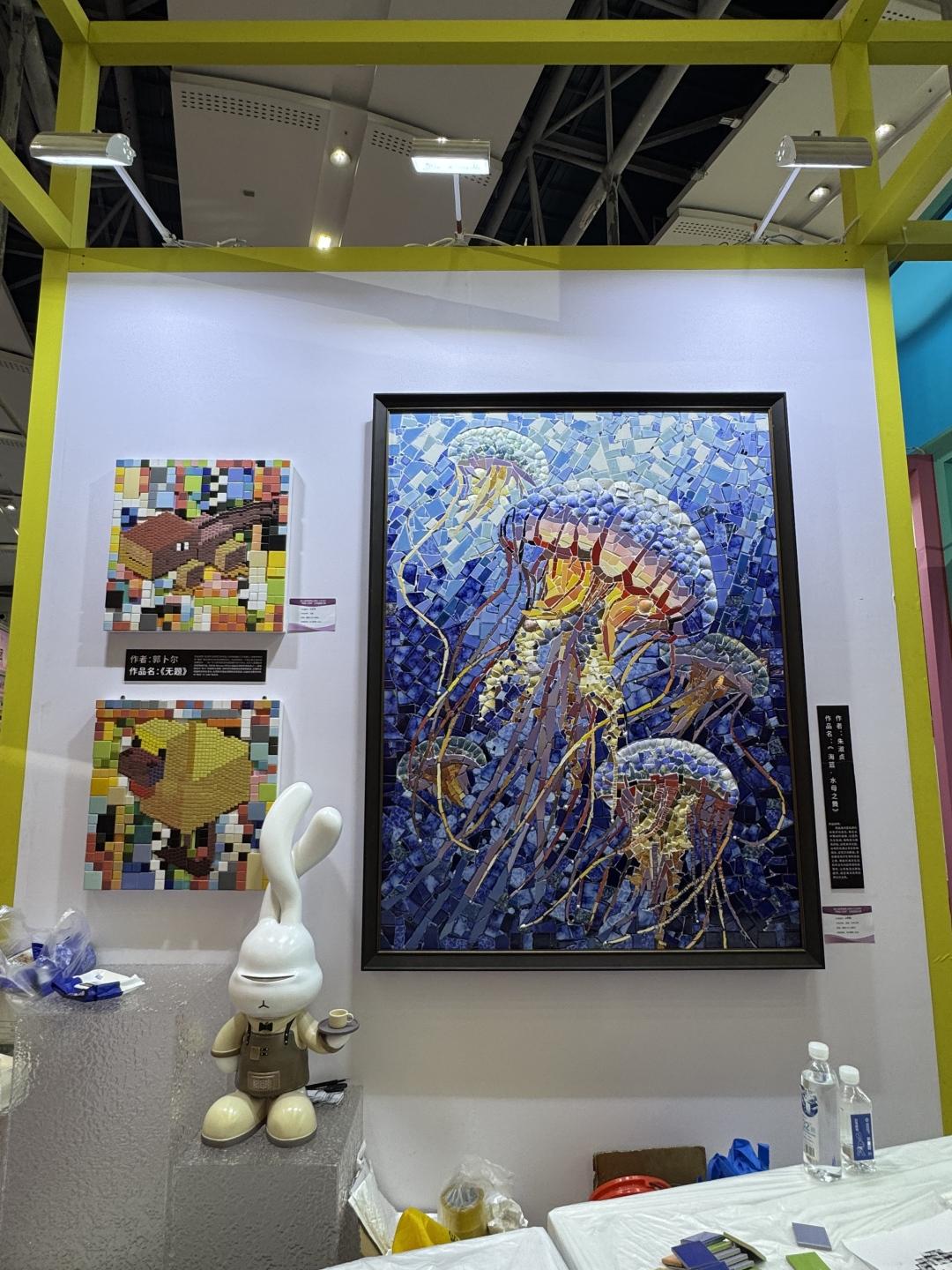 其中,一家瓷砖企业的展位格外醒目,在其内部设置的“瓷砖乐高”活动体验区,前来逛展的大人和孩子们正将各色9×9mm大小的彩釉瓷片设计出各式各样的图案,做成一个又一个精美的工艺品。