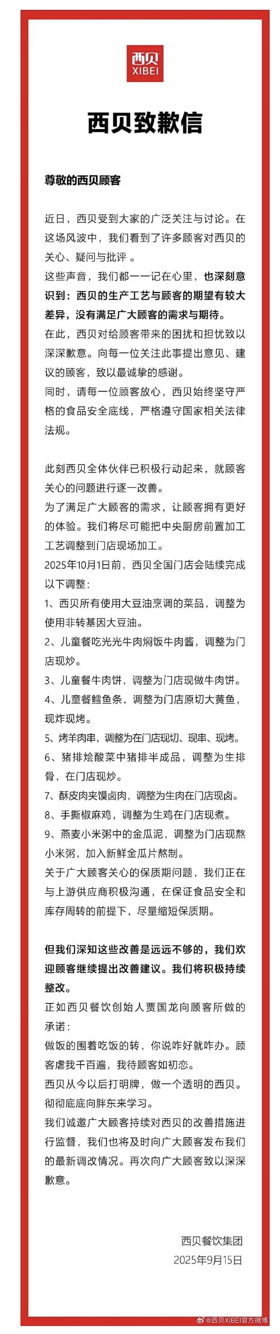 9月15日,西贝官方微博发布致歉信,儿童餐牛肉饼等部分菜品将调整为门店现做。