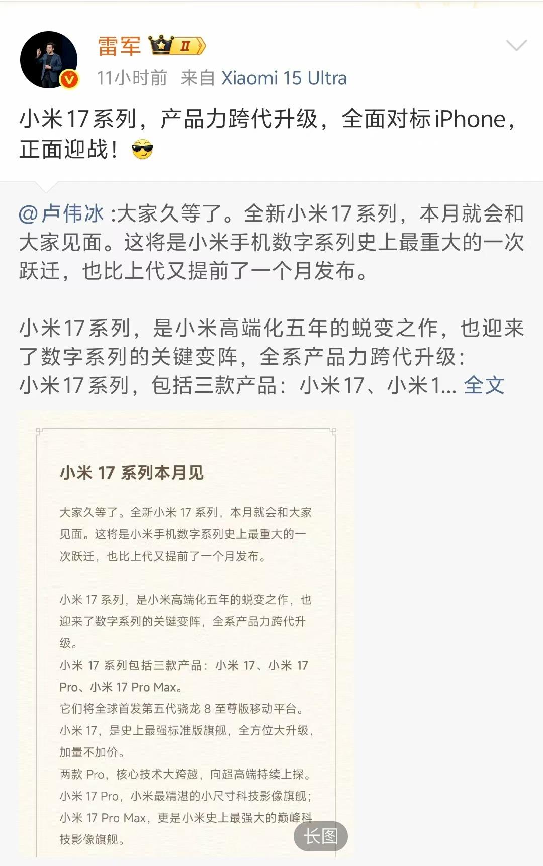 在官宣“小米16改名小米17”后,网友们热烈讨论的焦点集中在为何小米下一代手机会跳过“16”而直接命名“17”?对此,小米集团创始人、董事长兼CEO雷军在微博上的回应“颇有火药味”:“小米17系列,产品力跨代升级,全面对标iPhone,正面迎战!”在解释小米手机新系列跨代命名的原因时,小米集团总裁卢伟冰在微博中表示,小米17全系产品力将实现跨代升级,小米17系列三款产品将全球首发第五代骁龙8至尊版移动平台。小米17是“史上最强标准版旗舰”,两款Pro的核心技术也将实现大跨越,向超高端持续上探。另外,小米17 Pro将是小米最精湛的小尺寸科技影像旗舰,而小米17 Pro Max是小米史上最强大的巅峰科技影像旗舰。
