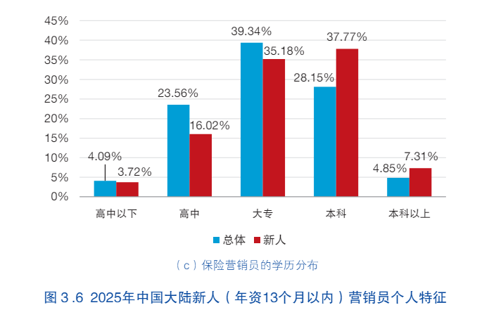 对于新生代的保险营销人员,最新调研群体画像显示,男性占比显著高于整体样本,占比最高的年龄段是35-44岁,且学历普遍更高。本科及以上的占比达到了45.1%,相比行业平均水平,高出了约12个百分点,体现了明显的行业专业化转型趋势。