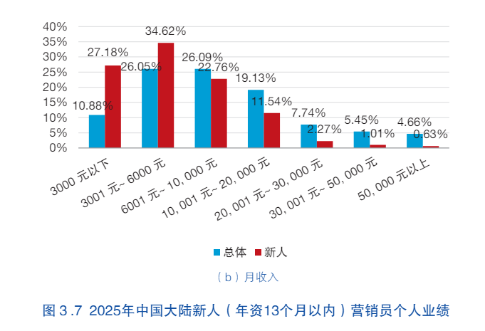 在市场最受关注的保险营销员收入方面,白皮书用调研数据“说话”:新人相对行业总体而言,在个人业绩方面面临着更大的挑战。具体来看,有62%的新人月收入在6000元以下,而行业整体仅37%的营销员月收入少于6000元。在新人群体中,月收入处于6001-20000元这一区间的,只占34.3%,比行业整体低了11个百分点。不过,依然有约4%的新人月收入达到了2万元以上。