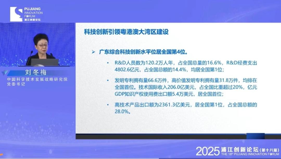 刘冬梅在报告中特别指出:“以广东为代表的综合科技创新能力也在提升,引领了粤港澳大湾区的建设。广东在研发人员数、研发经费支出方面居于全国首位。”报告数据显示,广东R&D人员数为120.2万人年,占全国总量的16.6%,R&D经费支出4802.6亿元,占全国总额的14.4%,均居全国第1位。此外,广东发明专利拥有量66.6万件,高价值发明专利拥有量31.8万件,均排在全国首位。