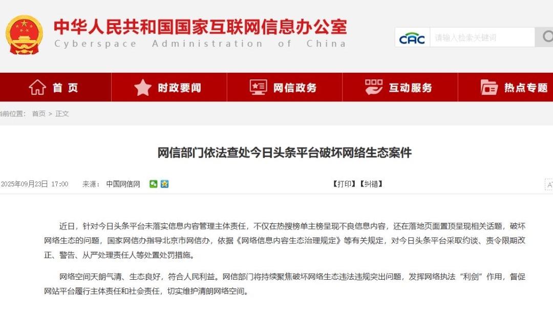近日,针对今日头条平台未落实信息内容管理主体责任,不仅在热搜榜单主榜呈现不良信息内容,还在落地页面置顶呈现相关话题,破坏网络生态的问题,国家网信办指导北京市网信办,依据《网络信息内容生态治理规定》等有关规定,对今日头条平台采取约谈、责令限期改正、警告、从严处理责任人等处置处罚措施。