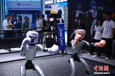 走进展馆,AI技术带来的互动体验令人耳目一新。在杭州宇树科技股份有限公司展台前的一个小型拳击台上,两个人形机器人戴着拳击手套,丝滑流畅地完成直拳、勾拳、正蹬等高难度动作,上演了一场酣畅淋漓的格斗表演。