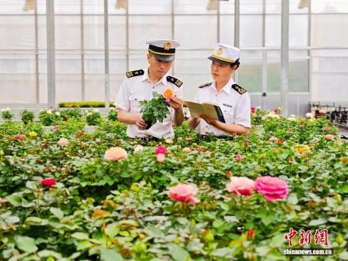 海关关员在昆明晋宁鲜花种植基地对出口玫瑰开展日常监管。戴玮琪 摄