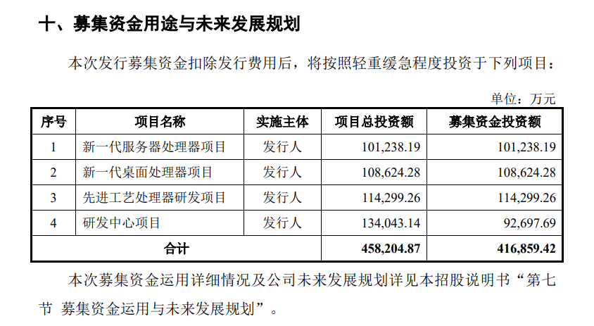 根据招股书,兆芯集成本次拟发行股份不超过38286.7700万股(且不低于本次发行后公司总股本的 10%,以中国证监会同意注册后的数量为准,每股面值人民币1.00元),计划募资41.69亿元。兆芯集成在招股书中表示,募集资金用于提升“开先”系列桌面PC/嵌入式处理器和“开胜”系列服务器处理器的技术研发和产业化实力,新一代桌面PC处理器和服务器处理器的功能、性能和能效比将显著提升,进一步缩小与国际顶尖水平的差距。此外,先进工艺处理器研发项目将对现有处理器产品进行境内工艺和关键IP技术研究,不仅可以优化产品工艺,亦能增强其与境内半导体厂商的紧密合作,提升产品的持续供应和保障能力。
