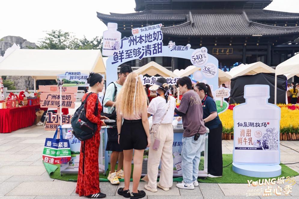 市集内,“蔡澜点心”的酥皮山楂叉烧包香气诱人,“老西关濑粉”的传统水菱角勾起童年回忆,新兴家喻的酥皮焗羊奶则展现着创新精神。非遗点心课堂与“新鲜站”的人气最旺,点心课堂里,市民跟随陶陶居名师学习虾饺制作;“新鲜站”里,越秀风行牛奶带来的“仙泉湖牧场”清甜鲜牛乳叫人驻足,市民或净饮尝鲜,感受华南风土独有的清甜,或参与以鲜奶创意搭配广式点心的互动,在轻松游戏与细细品味中,感受本土优质奶源与广府饮食文化碰撞出的新奇乐趣。